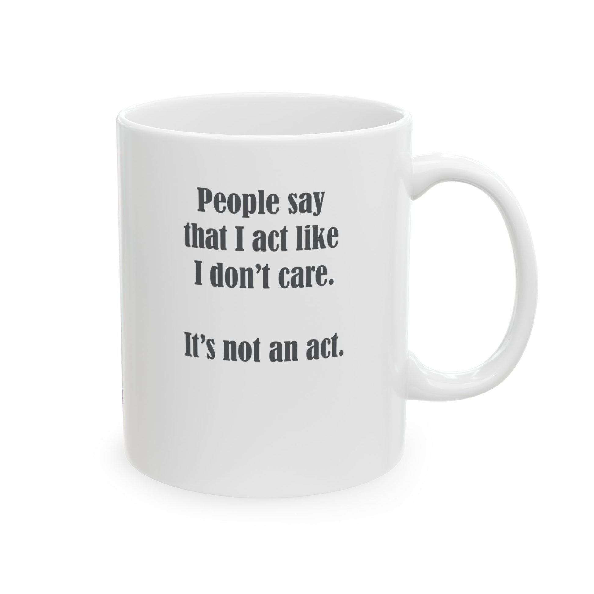Introducing our "I Don't Care" Coffee Mug. This is your morning ritual of unapologetic disregard for the trivial. This mug is your daily affirmation that you're not faking it - you genuinely don't care about the small stuff anymore. Microwave and dishwasher safe, because who has time for handwashing when you're mastering the art of selective caring? Here's to menopause, where not caring isn't an act; it's a lifestyle.